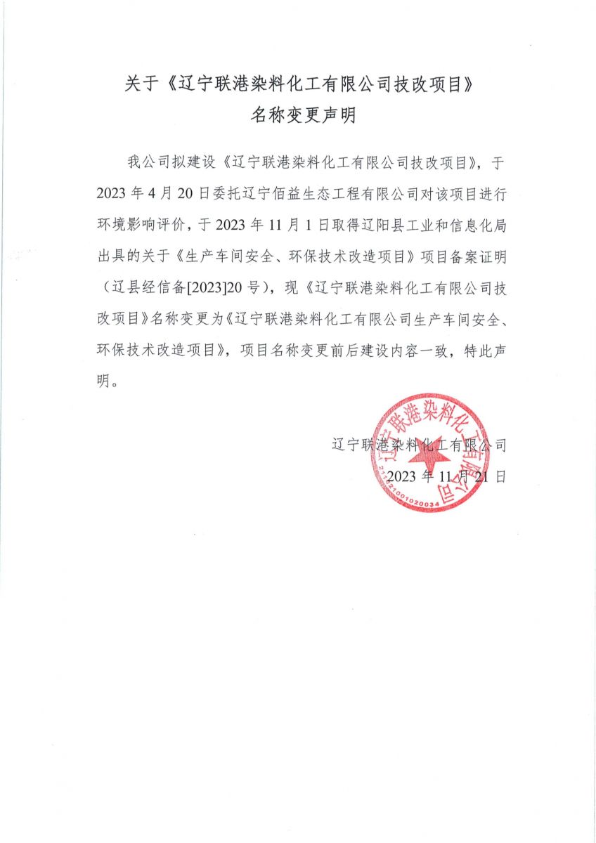 附件:關于《遼寧聯(lián)港染料化工有限公司技改項目》名稱變更聲明.pdf